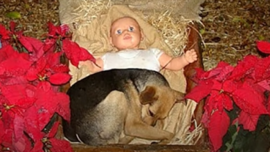 Homeless puppy is freezing in the night, but he finds warmth and shelter in nativity scene!